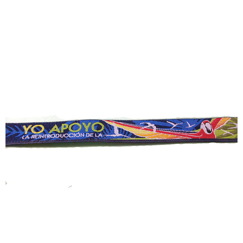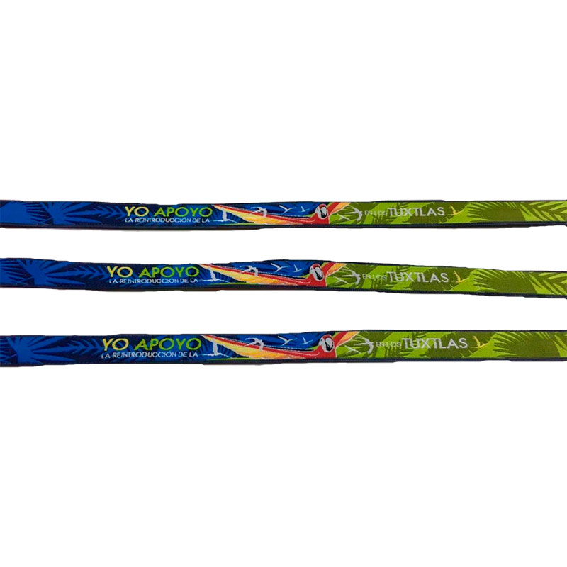 Pulsera conmemorativa del proyecto de “Reintroducción de la Guacamaya Roja en Los Tuxtlas, México con logo del proyecto y lema “Yo apoyo la reintroducción de la guacamaya roja en los Tuxtlas”.